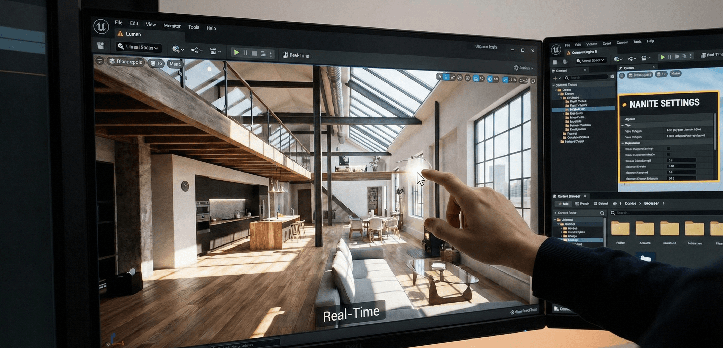 Interactivity: Instead of seeing just an image, clients can move through a virtual scene in real time. Change the lighting? Switch the time of day? In UE5, it happens instantly — no recalculation needed.
